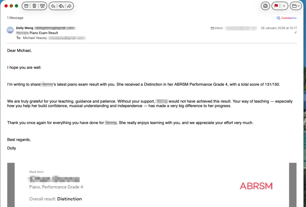 We are truly grateful for your teaching, guidance and patience. Without your support, **** would not have achieved this result. Your way of teaching — especially how you help her build confidence, musical understanding and independence — has made a very big difference to her progress.