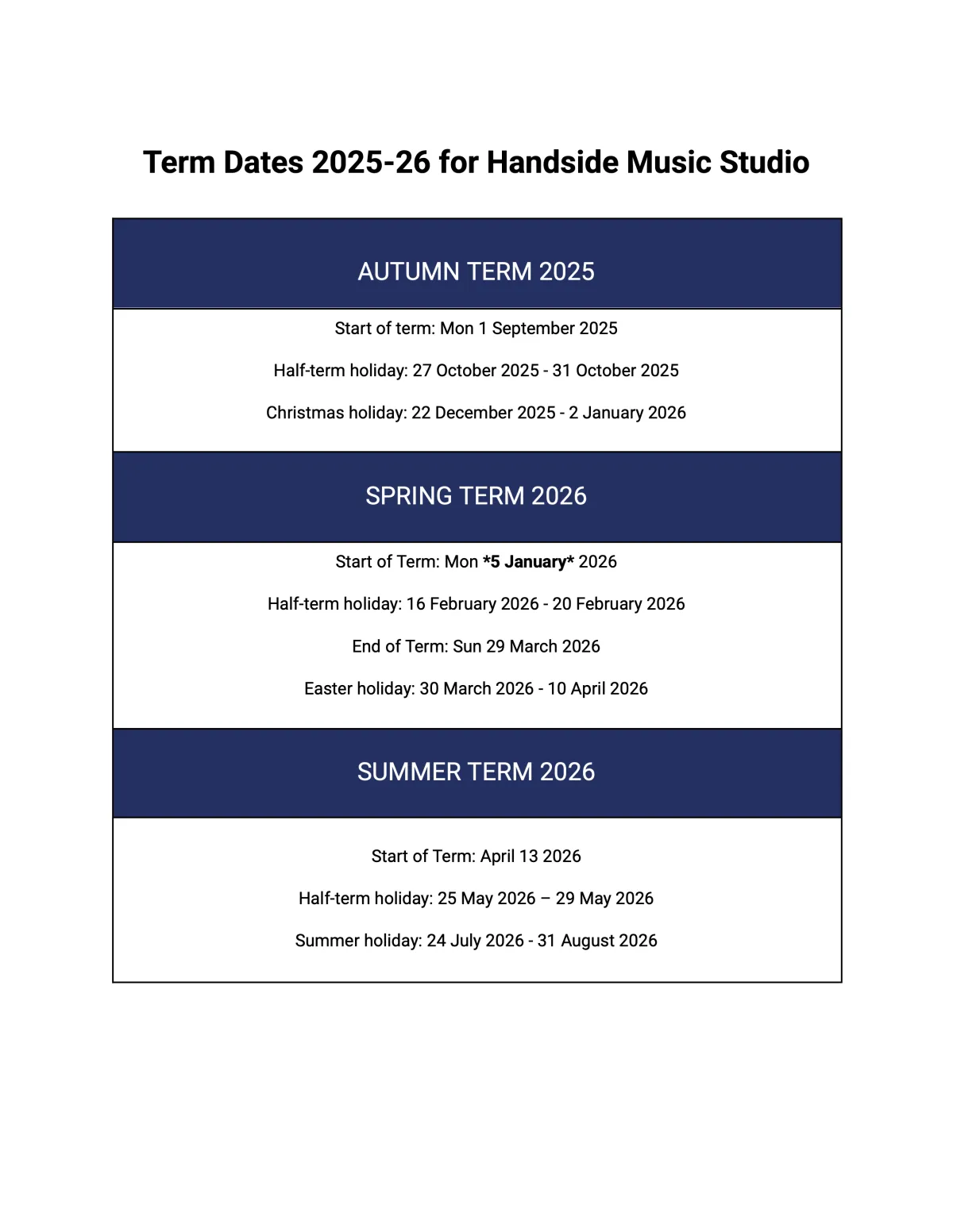 Click the image below to download the Term dates for Handside Music students in Welwyn Garden City and Harpenden.